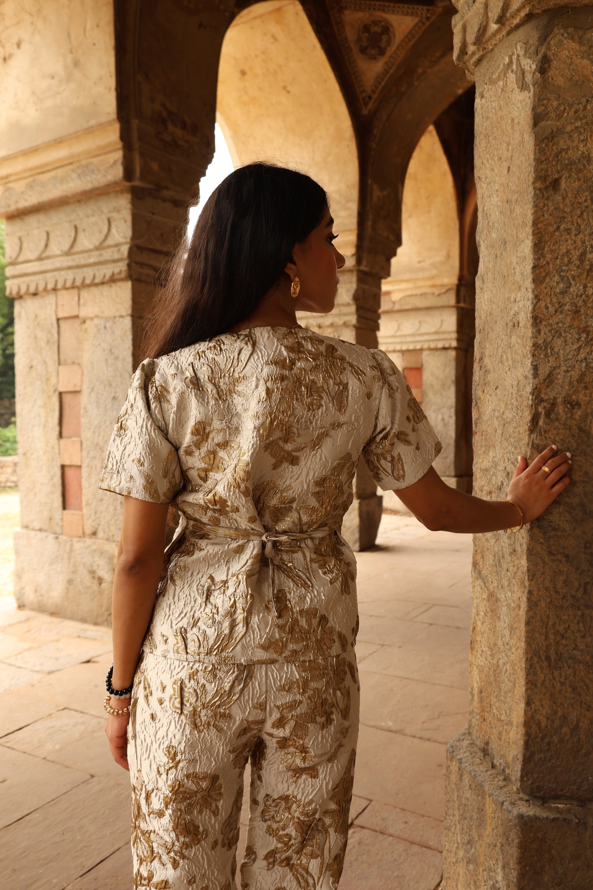 Jacquard foil set with floral motifs woven into the base fabric. A subtle U-neckline framed with gold buttons flatters the torso, while structured shoulders and high-rise straight-cut trousers sculpt a polished silhouette.