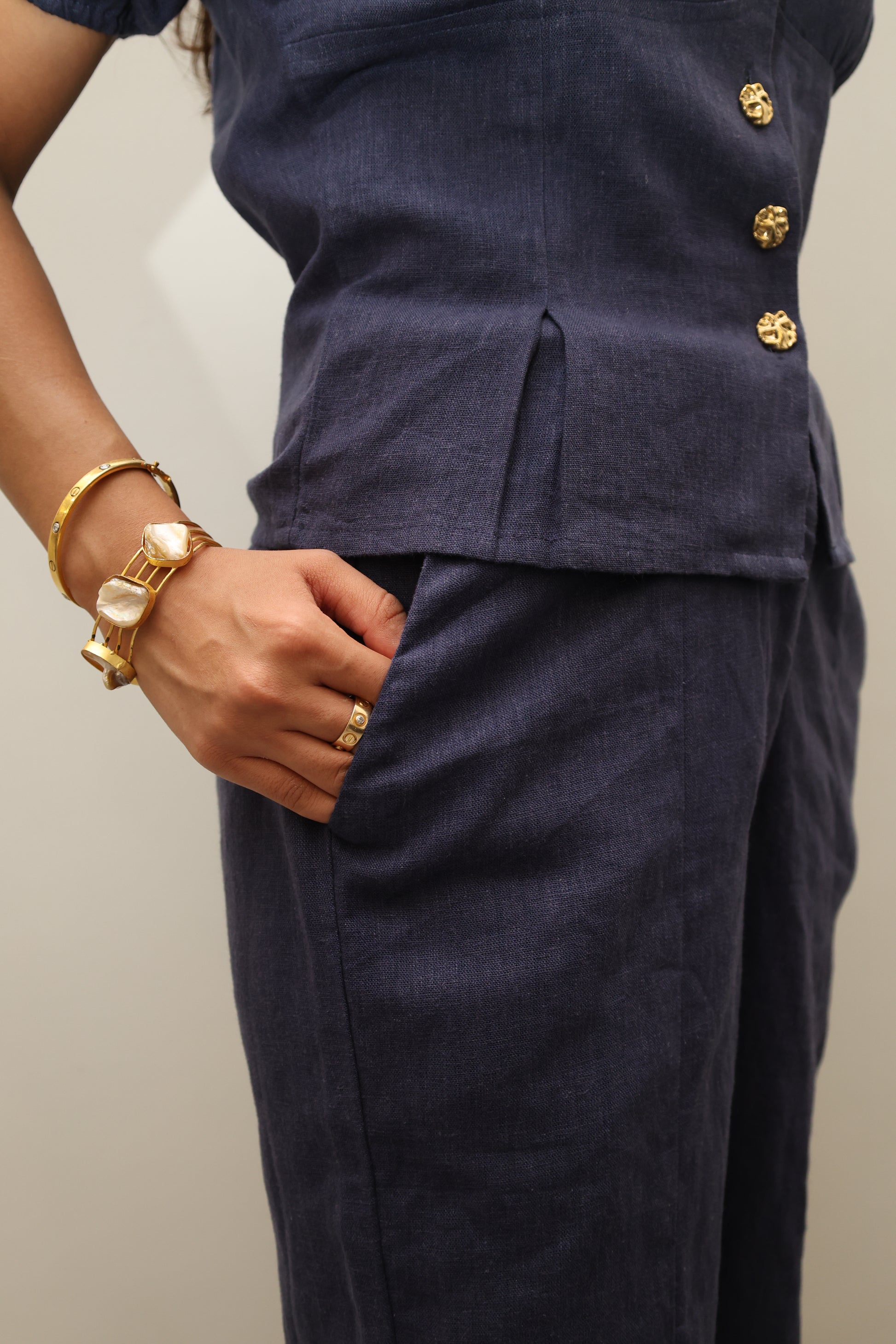 Made from cotton linen blend , it’s soft, breathable, non-sheer and keeps you feeling light and comfortable throughout the day. This fabric offers just the right amount of structure, while still being easy. From 9–5 to 5–9, this set does it all. This navy set keeps you looking sharp without compromising on ease.