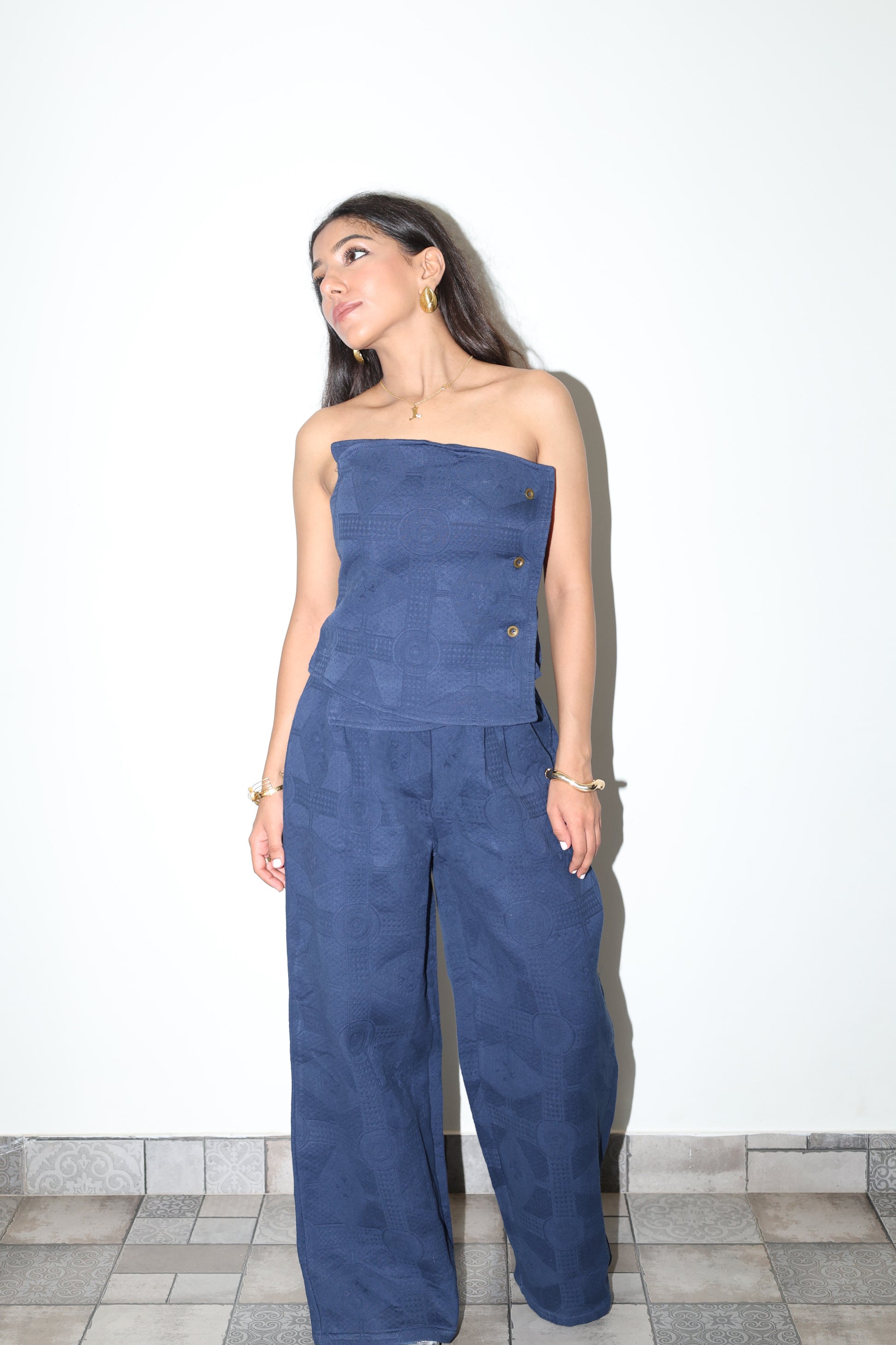 Effortlessly elevated — this lightweight jacquard set takes your look up a notch with zero compromise on comfort. Featuring a textured strapless corset top and structured barrel pants, it’s the kind of outfit that’s formal and laid-back, bold and wearable. Basically? Your new go-to for when you want to feel put together but not overdone.